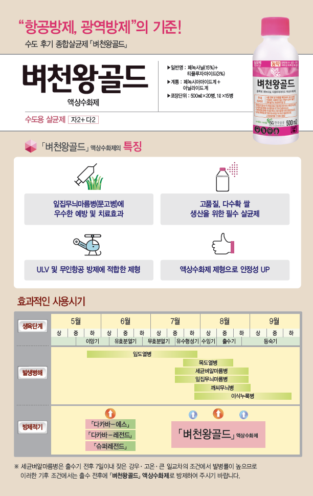 | 벼 | 살균제 | 안빌(유), 후치왕(유), 골드미(액상), 몬세렌(액상), 아끼미(유현), 올크린(액상), 헬리건(액상) |