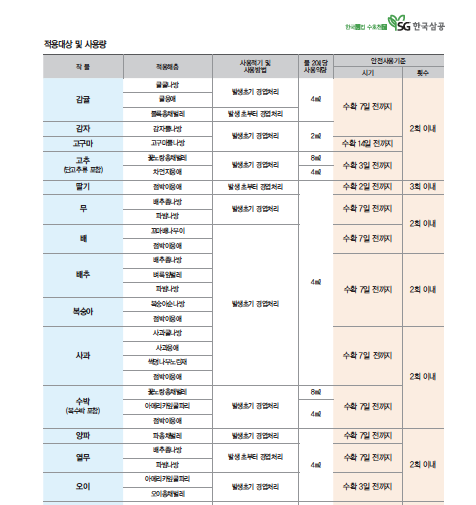 | 배 | 꼬마배나무이 | 발생 초부터 경엽처리 | 5000배 - | 수확7일전 | 2회 | 20220530 |