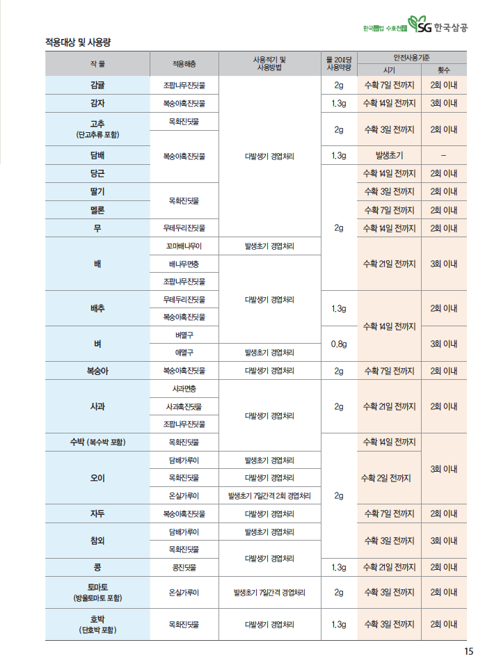 | 배 | 꼬마배나무이 | 발생 초부터 경엽처리 | 10000배 - | 수확21일전 | 3회 | 20200109 |