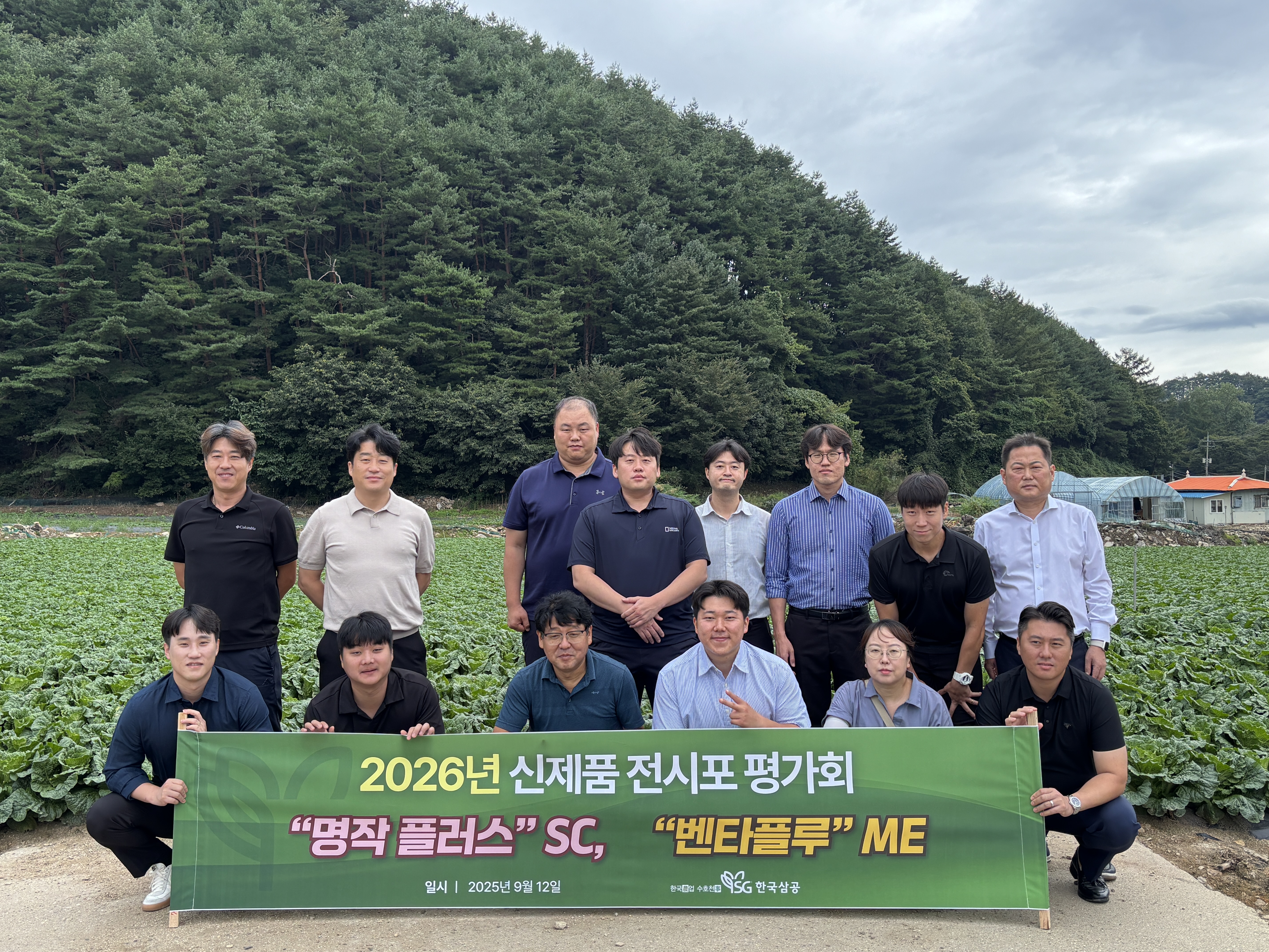 SG한국삼공(대표이사 한동우)은 9월 12일 강원도 평창군에서 2026년 출시 예정인 배추 뿌리혹병 효과적인 예방, 치료제 「명작플러스」SC와 「벤타플루」ME의 성공적인 출시를 위한 전시포(시범포장) 평가회를 가졌다. 이날 본사 CRM팀 및 전국 FM직원들을 대상으로 대상약제를 살포한 포장의 사용결과 발표와 배추포장에서 직접 생육상태 및 병발생 등을 확인하였다.